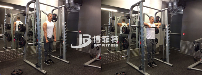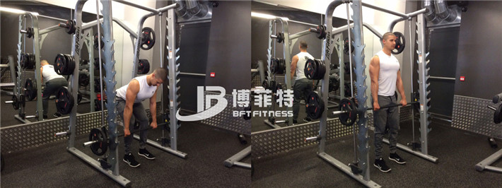 站在史密斯的機(jī)器里,保持你的腳和肩部同寬,用手緊緊握杠鈴的的手把。你的臀部和羅馬尼亞硬拉動(dòng)作保持一致,你的手臂可以完全的伸展。把杠鈴拉向中間部分,暫停,然后慢慢地向下推,完直到全伸直你的手臂。