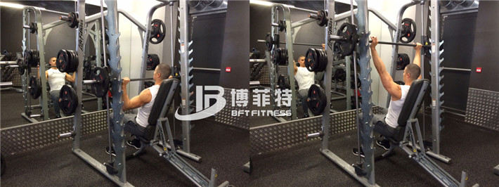 把長凳放置史密斯機(jī)下,平躺在長凳上,把你的手臂向上完全伸直握住杠鈴杠,慢慢地把杠鈴?fù)路胖钡诫x你胸口還有兩三厘米的地方暫停,然后再將杠鈴杠向上推回原來的位置
